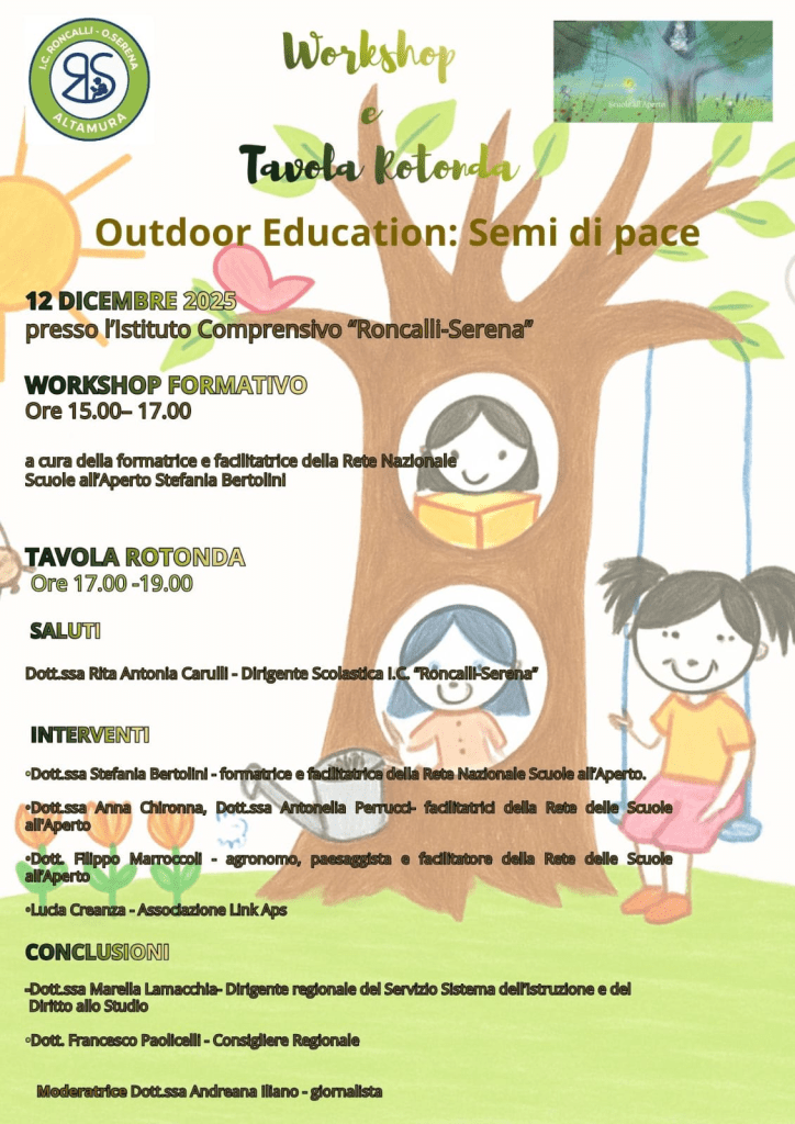 “Semi di pace” vuole essere un’occasione per scoprire come l’outdoor education possa migliorare il benessere e l’apprendimento dei bambini. Attraverso esperienze all’aria aperta, la scuola primaria può diventare un luogo in cui coltivare collaborazione, rispetto e curiosità, favorendo relazioni positive e un clima di classe più sereno. La tavola rotonda e i momenti formativi offriranno spunti pratici, testimonianze e idee per portare la natura al centro del percorso educativo.